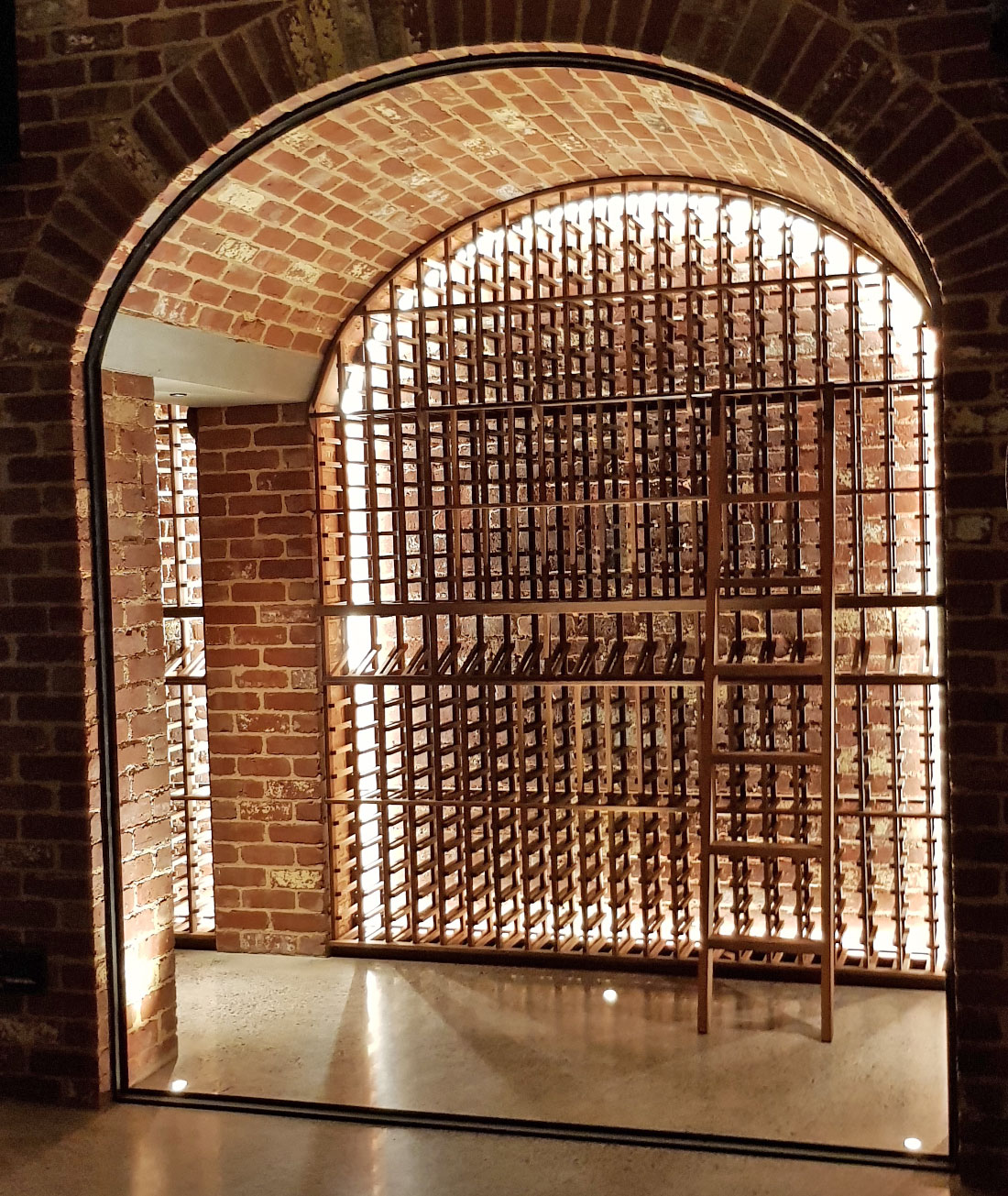 A blackened ash wine rack installation to a feature basement wine cellar featuring recycled reds brick walls and arched ceilings. Each wine rack with arched top fitted to match brickwork, offset and backlit with custom ladder and rail. Central display racking with lighting pelmets to...