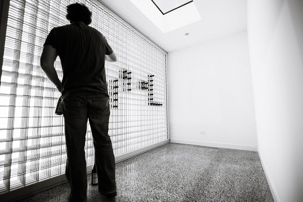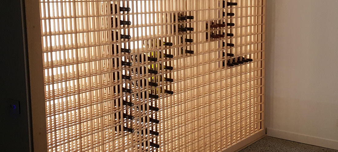 Our shoji wine racks are handcrafted using traditional Japanese techniques. The racking is offset and backlit providing a warmth to the cellar.